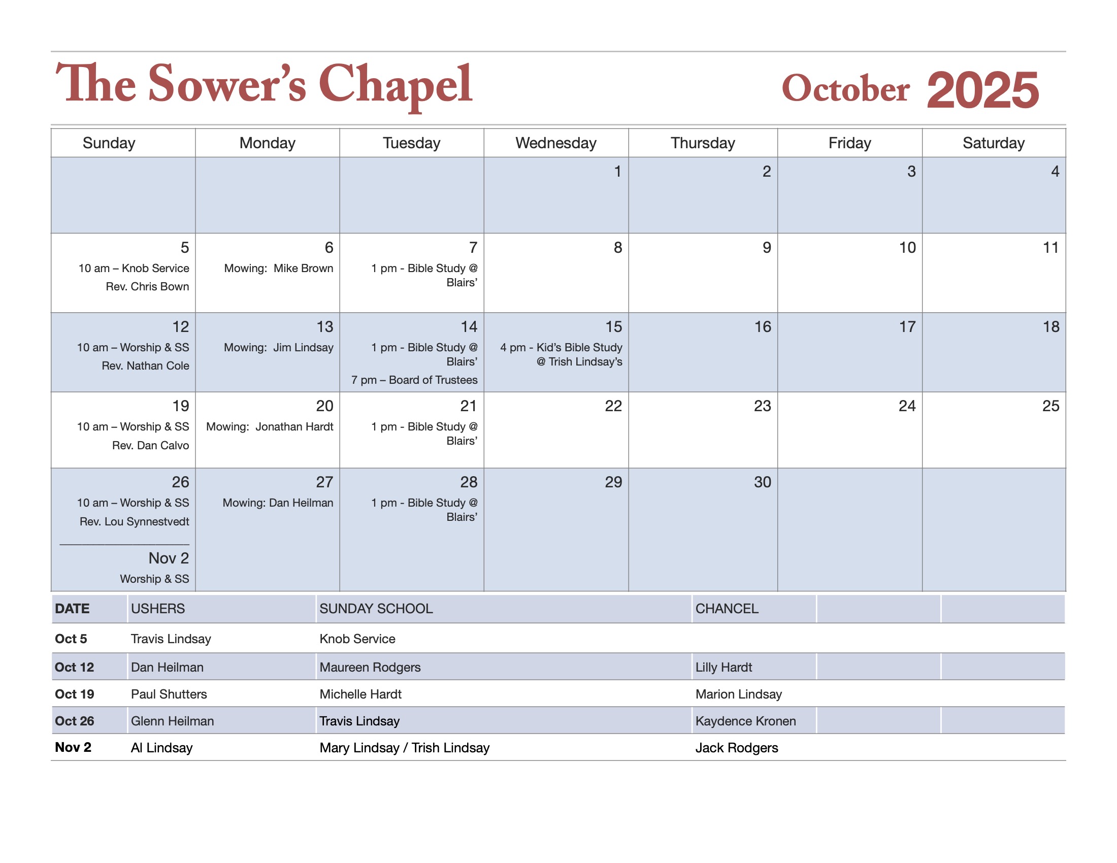Trish Lindsay will lead classes the first Sunday of each month during Sunday School time, as well as once a month in her home, date to change depending on kids’ schedules.